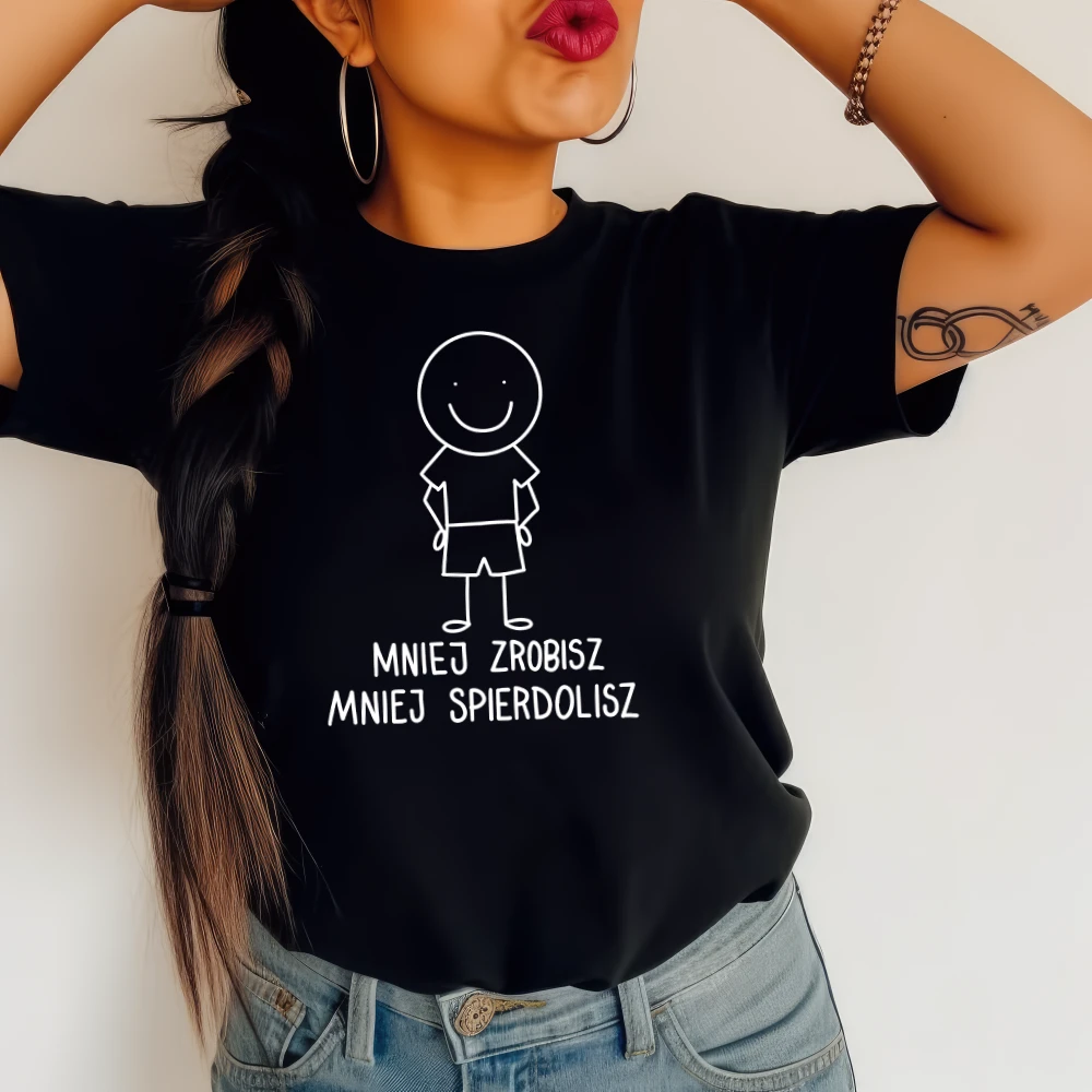 CZARNA Koszulka ze śmiesznym nadrukiem, mniej zrobisz mniej spierdolisz