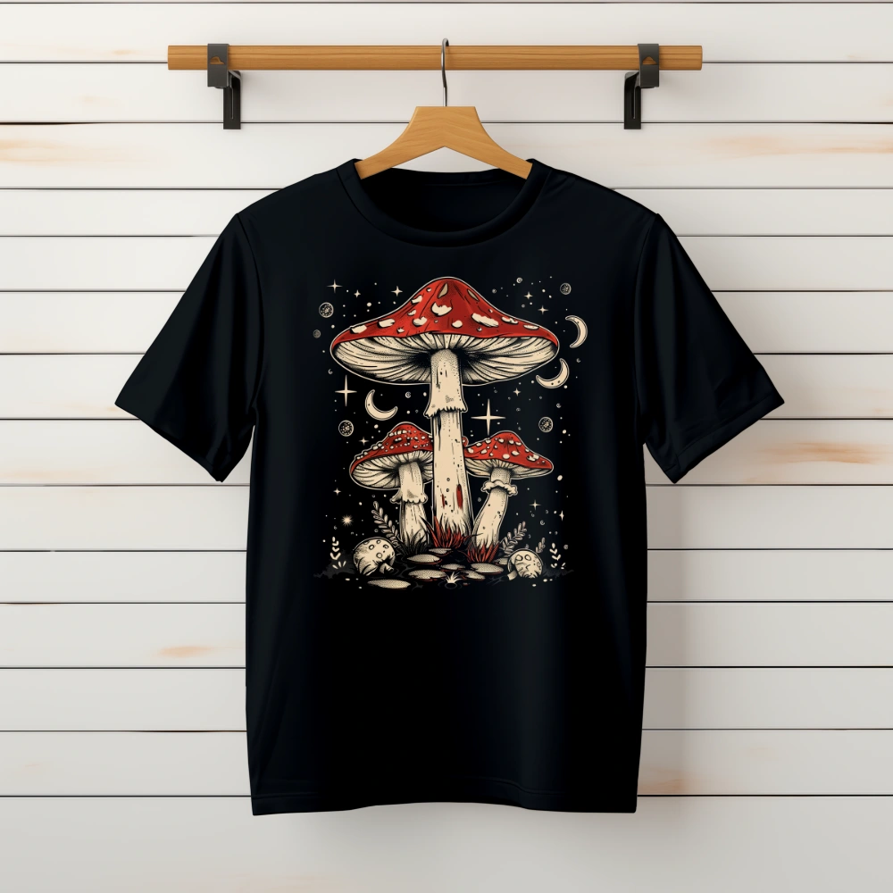 Czarna damska koszulka z fajną grafiką grzybów