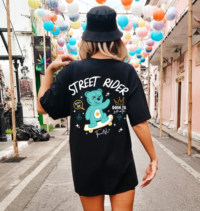 Koszulka wyróżnia się efektownym nadrukiem na plecach, który nadaje jej unikalny wygląd. W zależności od wzoru może być minimalistyczna i subtelna lub bardziej wyrazista – idealna dla kobiet, które lubią wyróżniać się w tłumie. Czysta czerń materiału sprawia, że nadruk jest dobrze widoczny, a całość prezentuje się nowocześnie i stylowo.