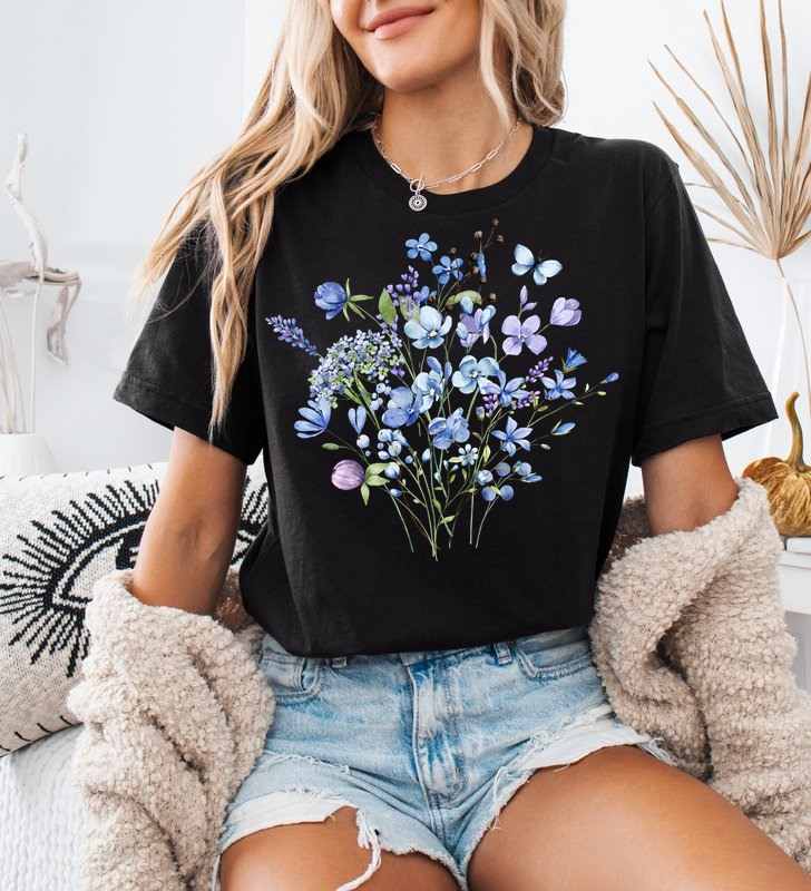 Czarna koszulka damska z nadrukiem niebieskich kwiatów - wzór kwiat6
