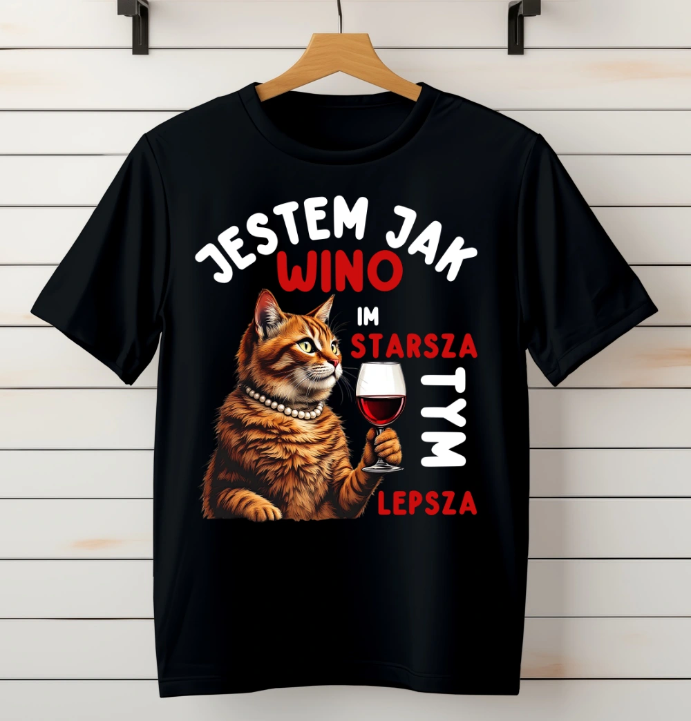 Koszulka damska "Jestem jak wino – im starsza, tym lepsza" z nadrukiem kota z kieliszkiem wina to idealna propozycja dla kobiet z dystansem do siebie, które cenią humor i styl. Klasyczna czarna koszulka wyróżnia się zabawnym napisem oraz uroczym nadrukiem przedstawiającym kota z kieliszkiem wina, co dodaje całości wyjątkowego charakteru.