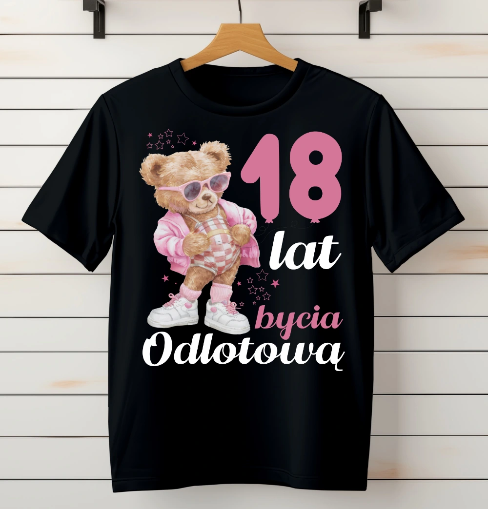 Na przodzie znajduje się wyrazisty nadruk "18 lat bycia odlotową", który podkreśla energię i wyjątkowość jubilatki.
