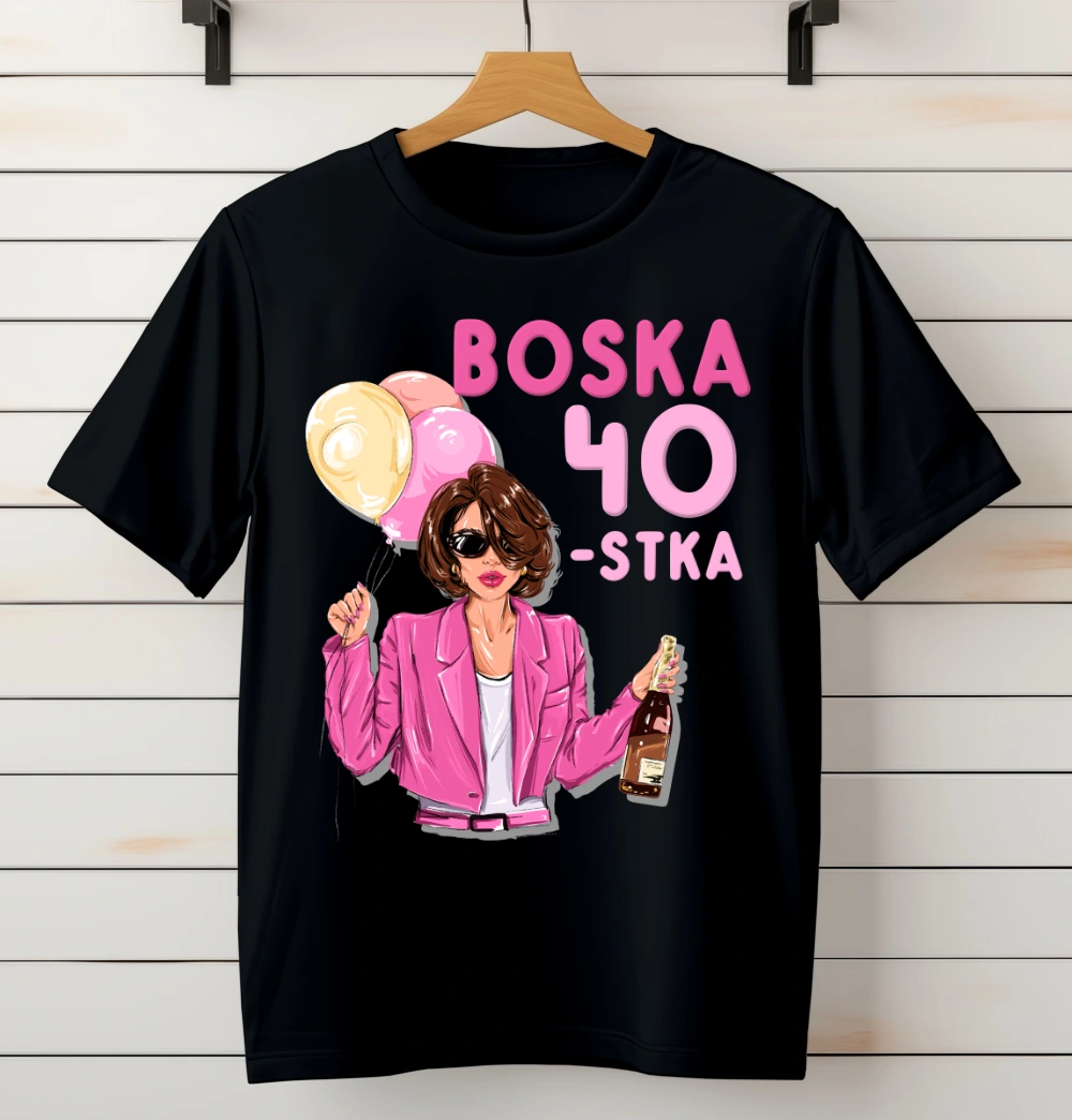 - Nadruk: "Boska 40-tka" z grafiką brunetki – stylowy i przyciągający wzrok projekt, który wyróżnia się elegancją i odwagą.