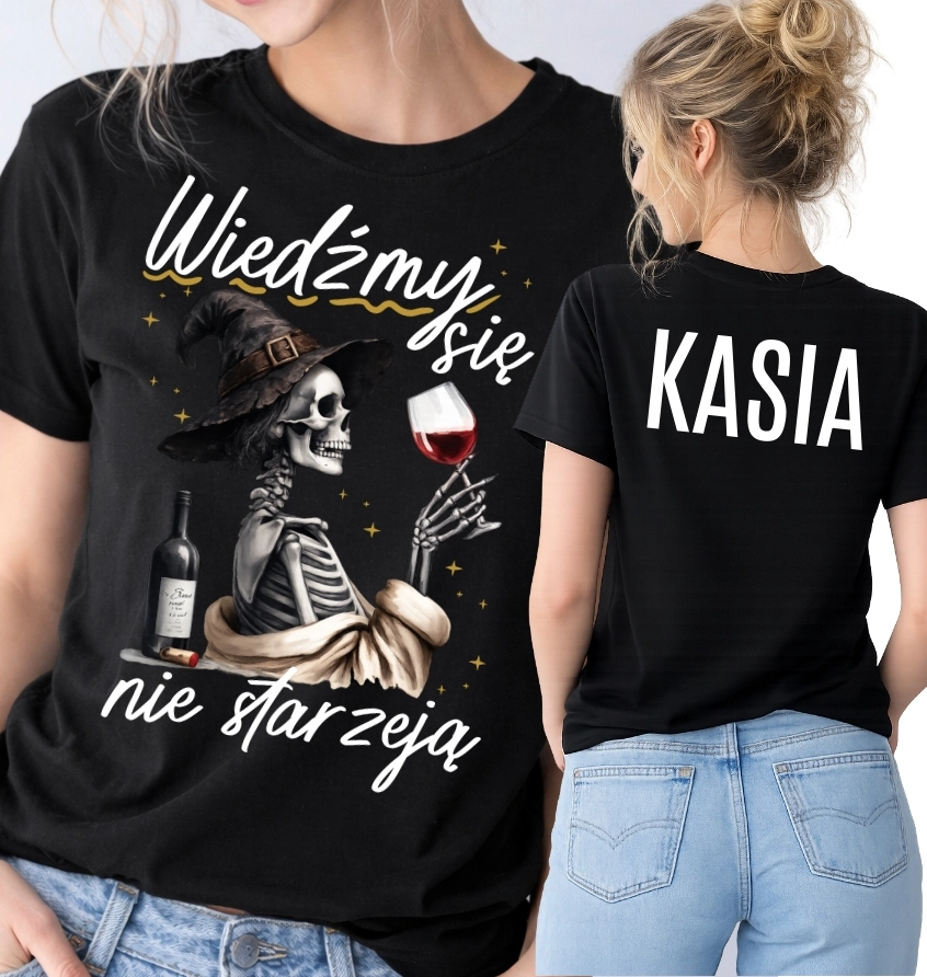 Koszulka wyróżnia się efektownym nadrukiem – elegancki szkielet w kapeluszu wiedźmy z kieliszkiem wina tworzy niepowtarzalny, lekko zadziorny klimat. To świetny wybór dla kobiet z dystansem do siebie, poczuciem humoru i charakterem.