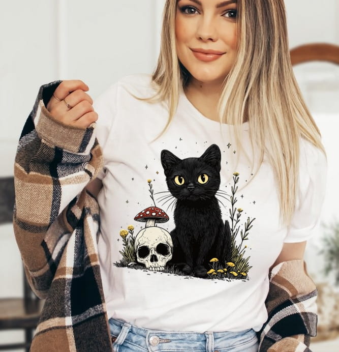 Damska biała koszulka z czarnym kotem