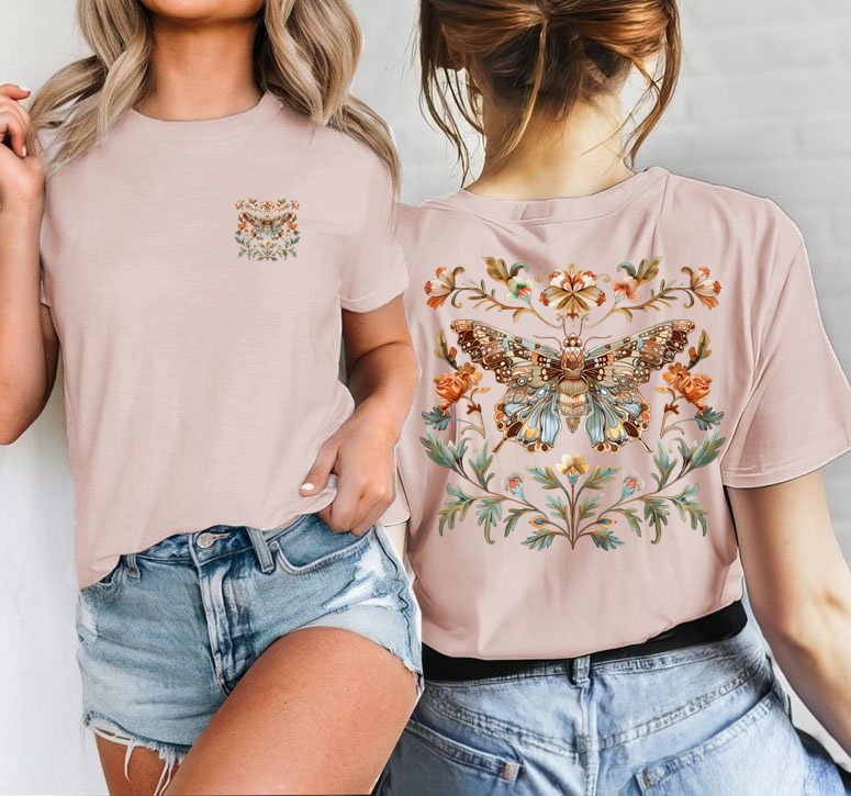 Damska koszulka w kolorze pudrowego róży z motylem na plecach oraz małym na sercu