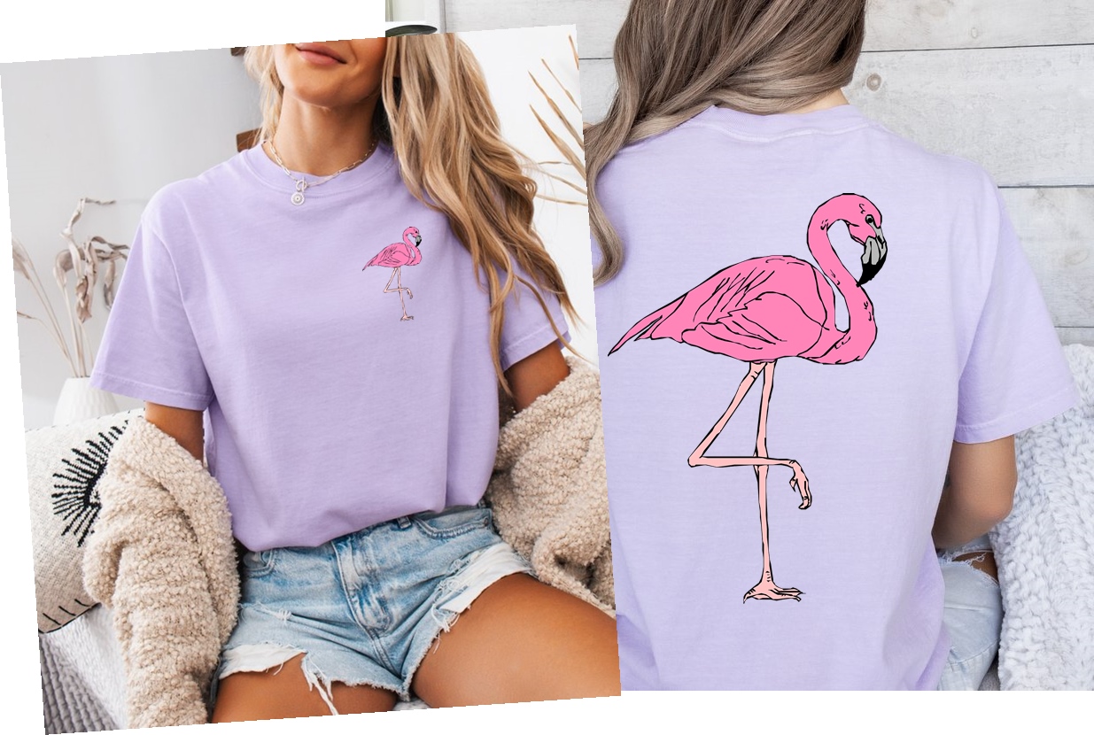 Fiołkowa koszulka damska z dużym flamingiem z tyłu plus mały na sercu
