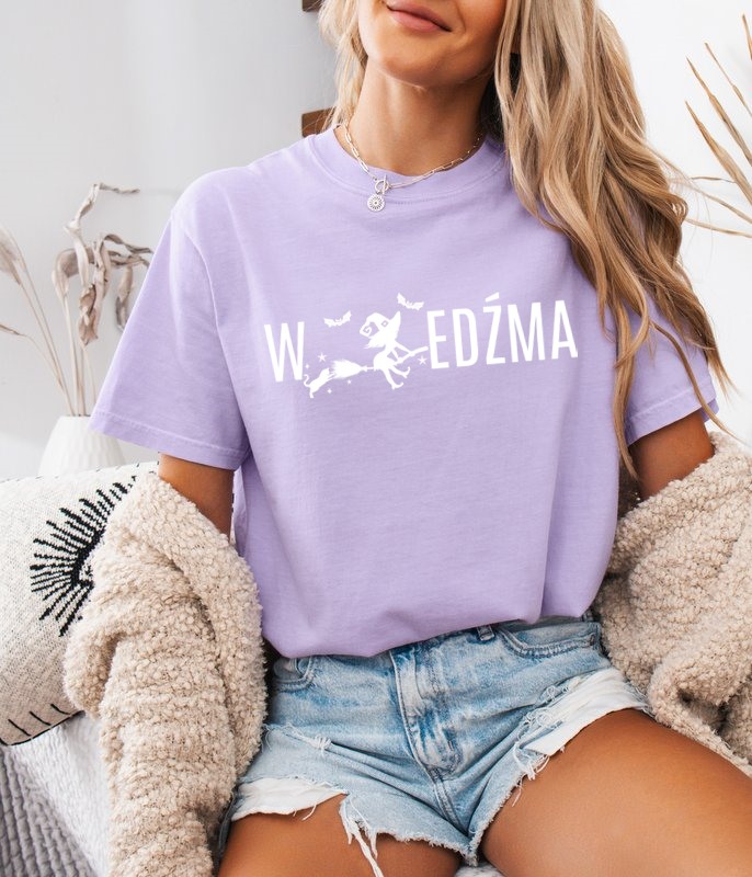 Fiołkowa koszulka damska z nadrukiem wiedźma