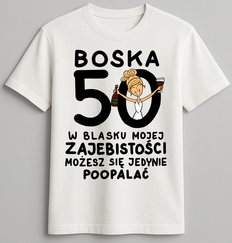 Koszulka biała urodzinowa - Boska 50 w blasku mojej zajebistości możesz się jedynie poopalać