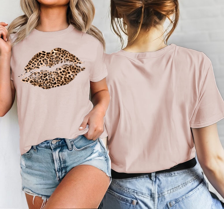 Koszulka damska USTA - kolor koszulki pudrowy róż - wzór usta panterka