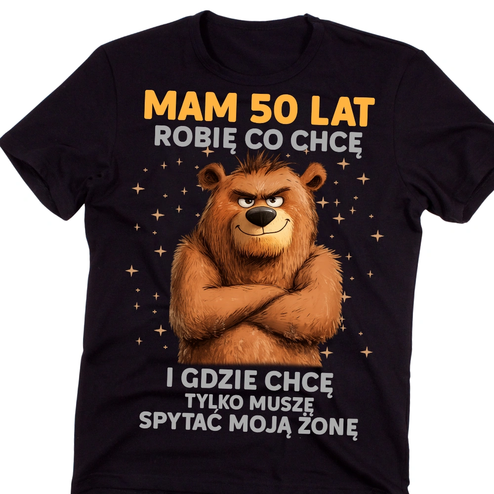 Szukasz oryginalnego i zabawnego prezentu na 40. urodziny dla mężczyzny? Ta koszulka męska z humorystycznym nadrukiem „Mam 50 lat, robię co chcę… i gdzie chcę, tylko muszę spytać moją żonę” to strzał w dziesiątkę! Grafika z pewnym siebie niedźwiedziem doskonale oddaje dystans do siebie i życia, który przychodzi z wiekiem – i robi to z przymrużeniem oka.