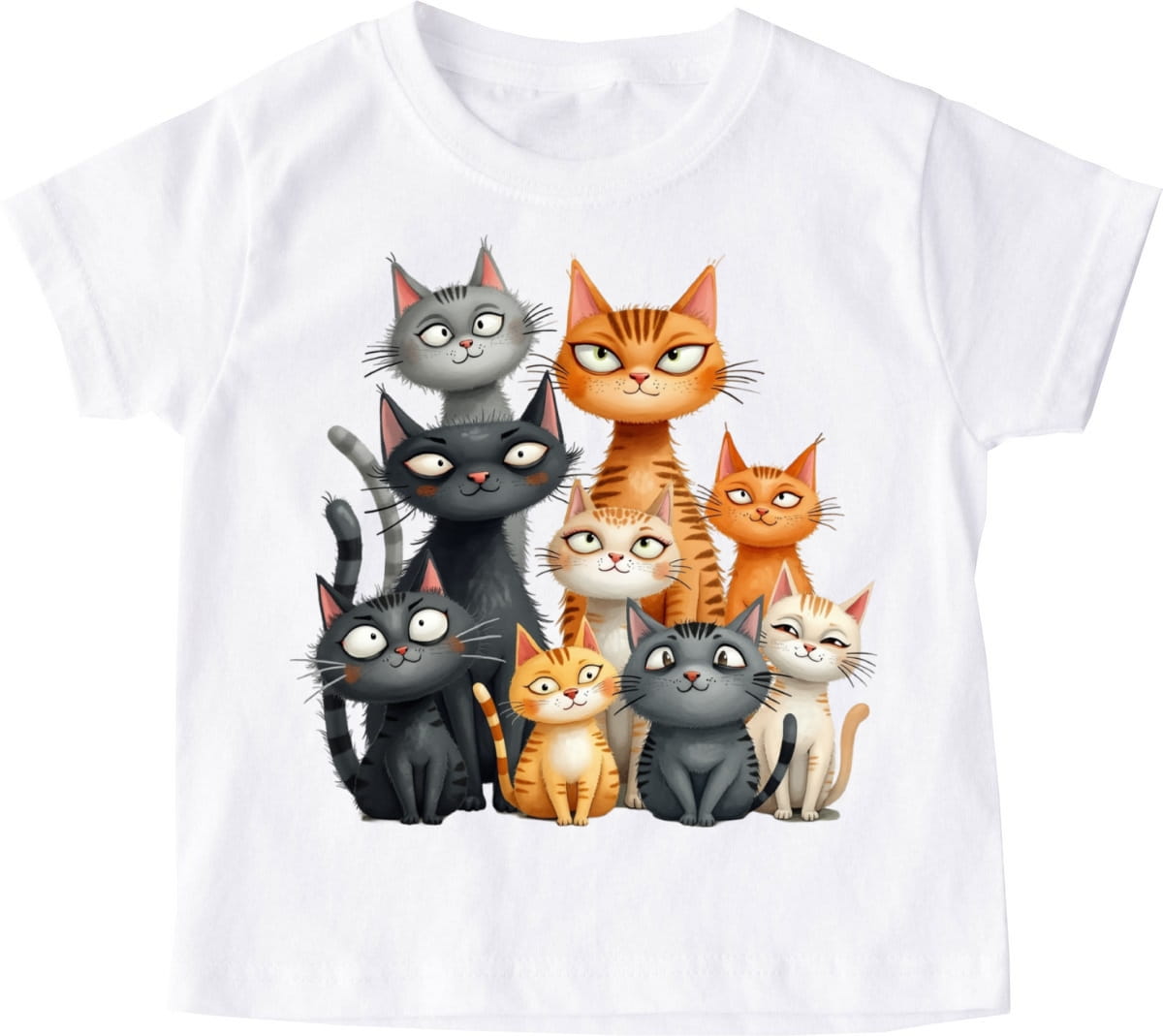 - Design: Koszulka z nadrukiem wesołego kota lub kotków – idealna dla dzieci, które kochają zwierzaki. Wzory przyjazne dla dzieci, pełne kolorów i uroczych detali.