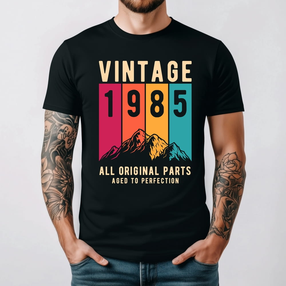 Czarna koszulka z nadrukiem " VINTAGE 1985 " to idealny wybór na 40. urodziny. Wykonana z wysokiej jakości bawełny, zapewnia komfort i styl. Nadruk w kontrastowych kolorach dodaje koszulce charakteru, a unikalny design nawiązuje do rocznika 1985 – perfekcyjny prezent dla mężczyzn ceniących sobie indywidualizm i poczucie humoru.