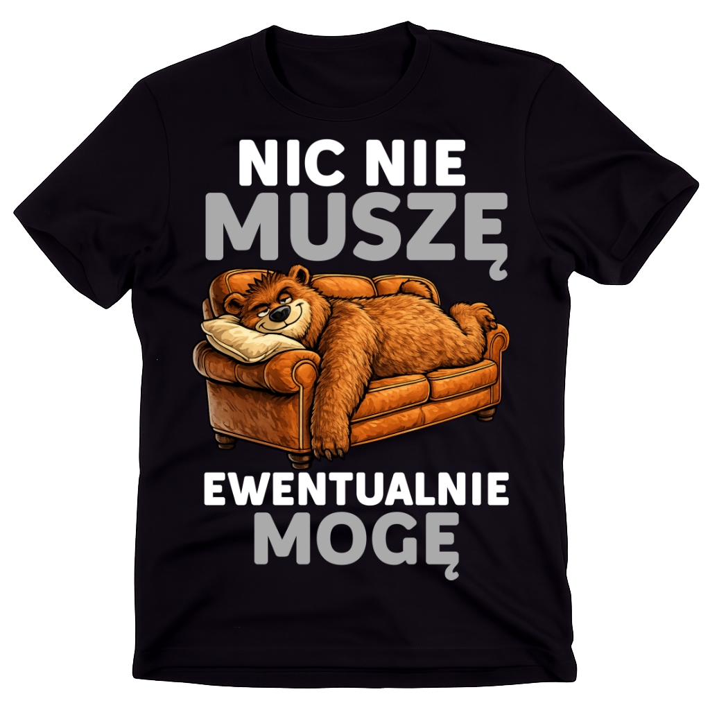 Męska koszulka z nadrukiem „Nic nie muszę, ewentualnie mogę” – śmieszny T-shirt z leniwym misiem