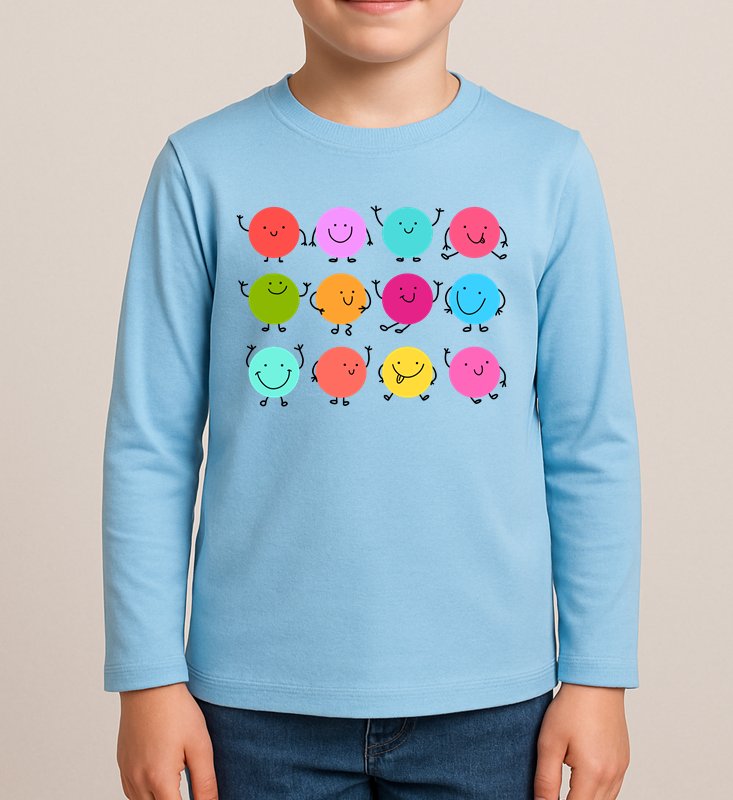 Niebieska koszulka z długim rękawkiem na Dzień Kropki dla chłopczyka kropki kolorowe z rączkami