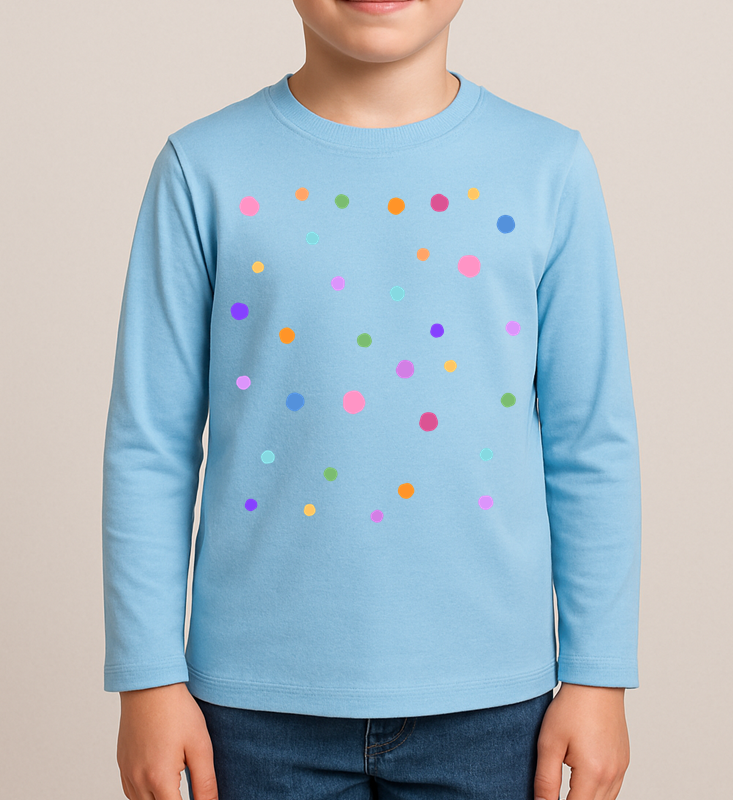Niebieska koszulka z długim rękawkiem na Dzień Kropki dla chłopczyka kropki wzór kropki kolorowe