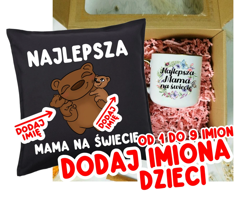 Prezent dla Mamy na Dzień Mamy - kubek Najlepsza mama na świecie plus poduszka z imionami dzieci