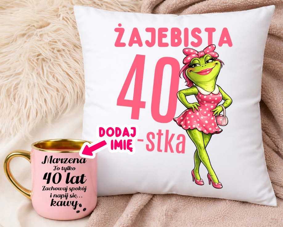Prezent na 40 urodziny dla kobiety - Personalizowany kubek na 40 urodziny oraz poduszka