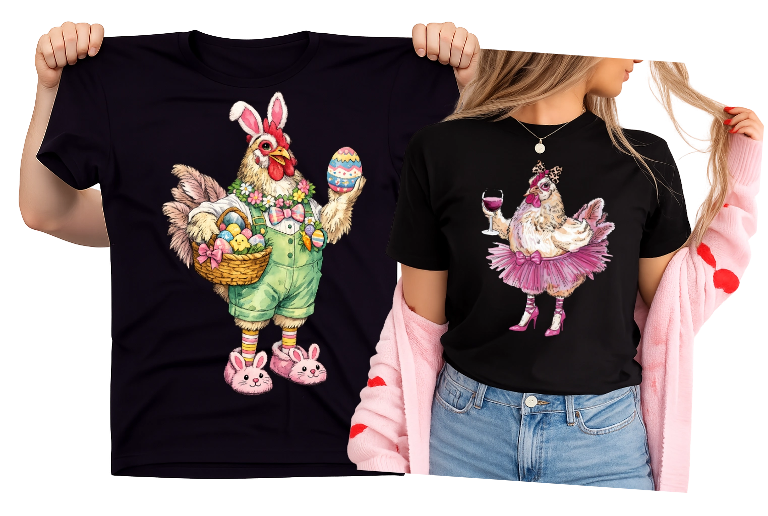 Zestaw dwóch koszulek dla pary na Wielkanoc z kogutem z koszykiem i kurką