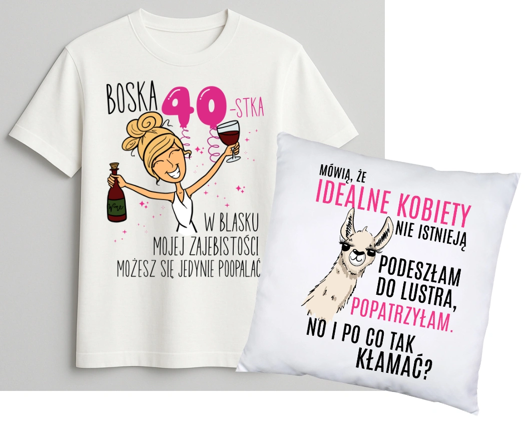 W skład zestawy wchodzą koszulka na 40 urodziny oraz dodatkowo poduszka z fajnym nadrukie,