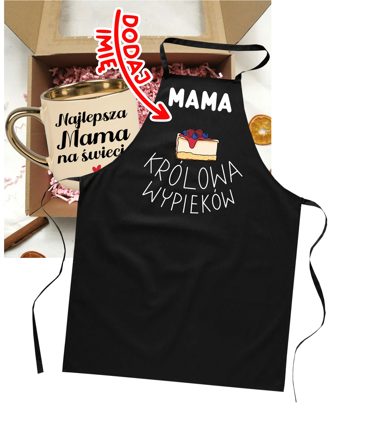 Zestaw prezentowy dla Mamy z okazji Dnia Mamy - kubek Najlepsza Mama na świecie oraz fartuch z imieniem - MAMA KRÓLOWA WYPIEKÓW