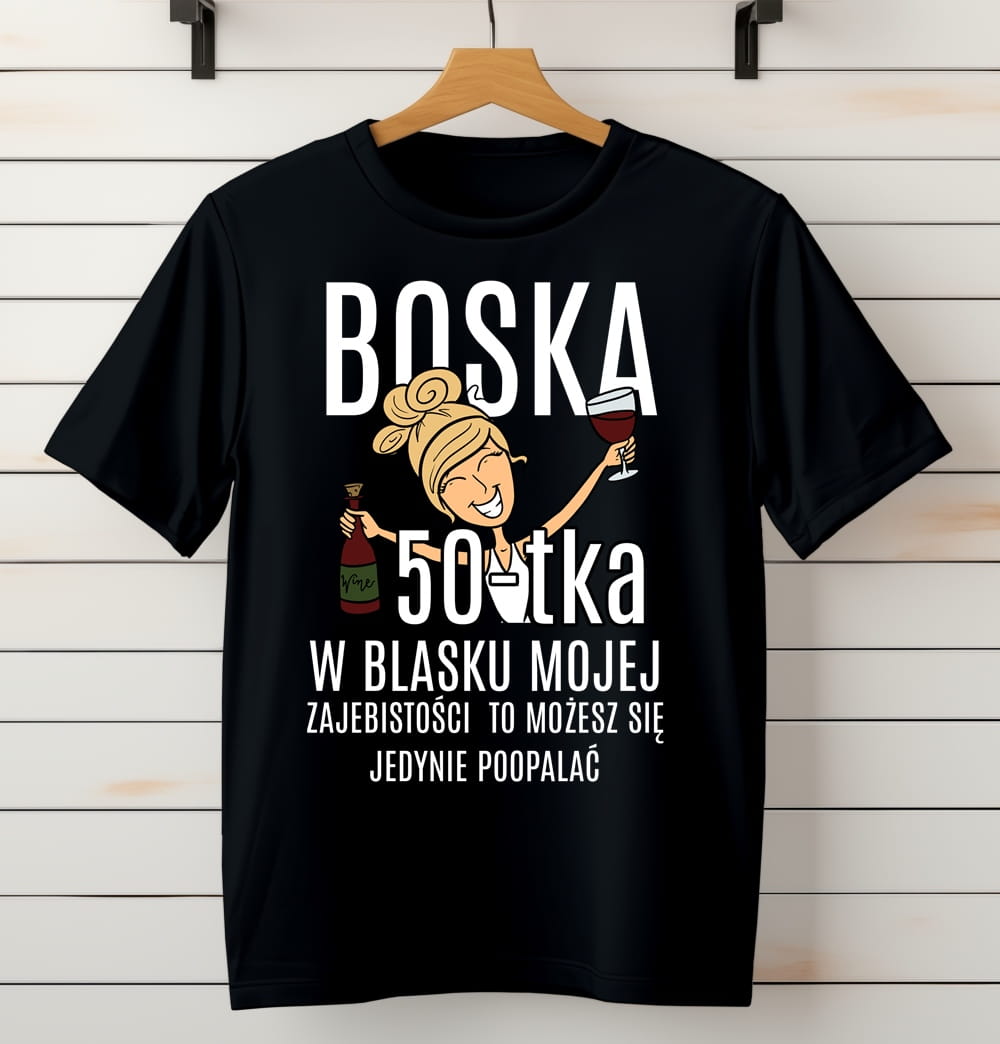 Koszulka damska na 50. urodziny, która zachwyca odważnym i zabawnym designem. Na przodzie widnieje napis „Boska 50 w blasku mojej zajebistości, możesz się tylko poopalać”, który doskonale oddaje pewność siebie i humor obdarowanej osoby. Koszulka jest idealna na wyjątkowy dzień, gdy trzeba świętować w stylu i z przymrużeniem oka! Wykonana z wysokiej jakości materiału, zapewnia komfort noszenia przez cały dzień. Doskonały wybór na imprezę urodzinową, wakacyjne celebracje lub jako prezent dla kobiety, która świętuje swoje 50-lecie z pełną energią. Oprócz zabawnego napisu, jej luźny krój gwarantuje wygodę i pasuje do wielu stylizacji.